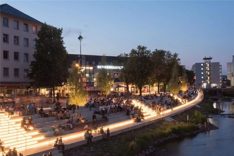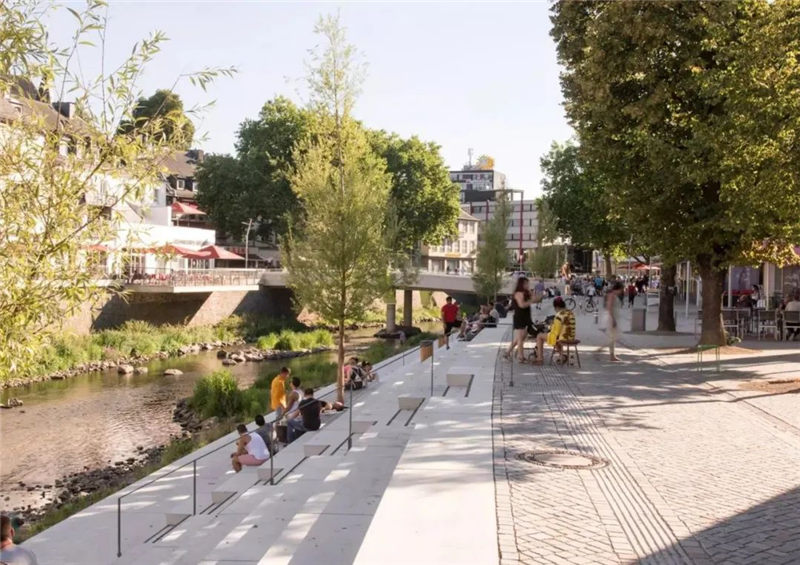 在拆除“ Siegplatte”(位于Sieg河堤防上的停車場(chǎng))之后,2012年至2016年期間沿著河段的大規(guī)模臺(tái)階建設(shè)使得新的直接通往河段的河流成為可能。錫根市中心。希格(Sieg)自然化,擁有草皮的島嶼和岸堤,可以使水生動(dòng)物和兩棲動(dòng)物通過(guò)生物通道。180米長(zhǎng)的樓梯雕塑在河邊,成為城市與河流互動(dòng)的表演舞臺(tái)。鑒于西格(Sieg)的自然風(fēng)光,西格特雷彭(Siegtreppen)變成了聚會(huì)場(chǎng)所。流域變成了上下城鎮(zhèn)之間的墊腳石。該項(xiàng)目獲得了無(wú)數(shù)獎(jiǎng)項(xiàng),并獲得了2017年德國(guó)景觀建筑獎(jiǎng)的“綠色基礎(chǔ)設(shè)施作為戰(zhàn)略”類別。