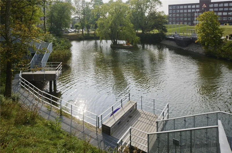 景觀設(shè)計(jì)的理念是讓人們以不同的方式去接近池塘陡峭的邊緣,這樣做的目的是在池塘周圍創(chuàng)造具有社會(huì)吸引力的場(chǎng)所和散步地。設(shè)計(jì)師建立了雙向設(shè)計(jì)原則,大池塘的西邊提供了可以駐足、坐下、觀景和約會(huì)的地方,這里的陽(yáng)光甲板和平臺(tái)位于水面之上,靠近邊緣。而東區(qū)則恰恰相反,那里有一條蜿蜒的長(zhǎng)廊,包含著一些較小的社交空間,沿著落差上下排布的樓梯在局部區(qū)域是一直延伸到水面的。